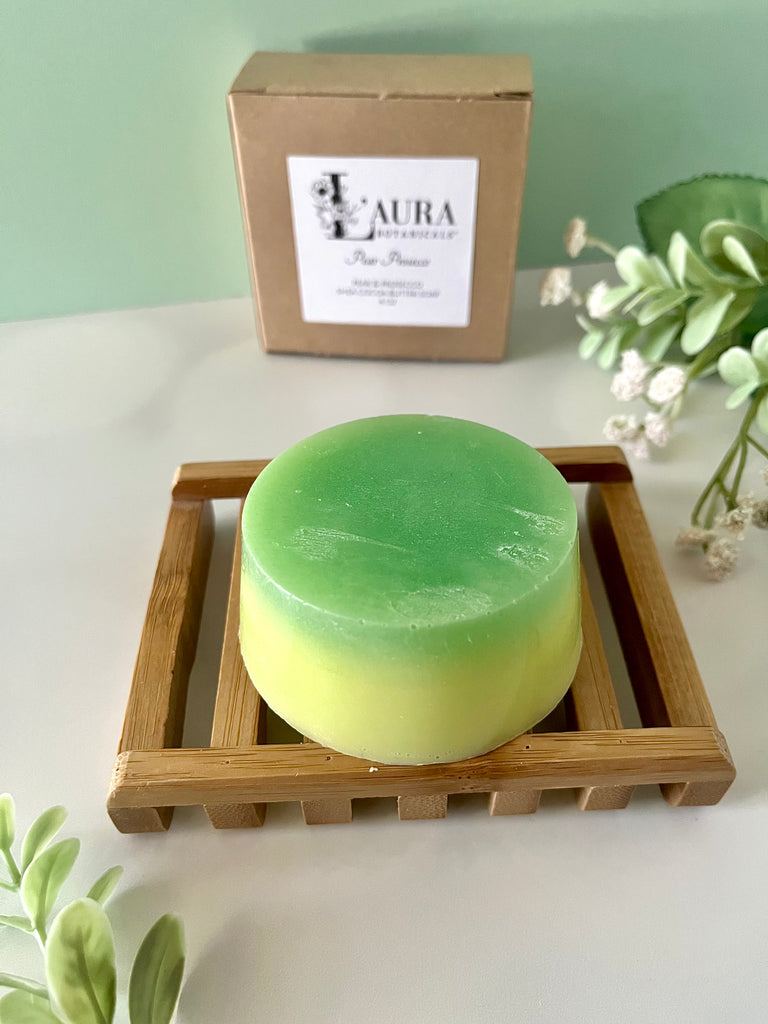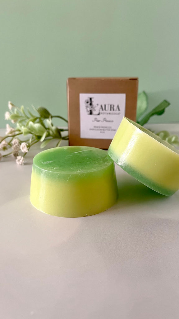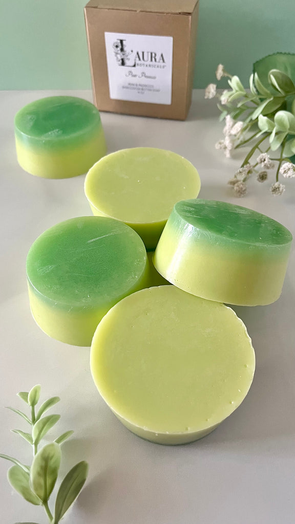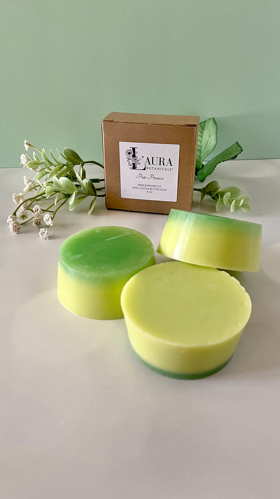 This listing is for one 4 oz Pear Prosecco Shea & Cocoa Butter soap bar/round.