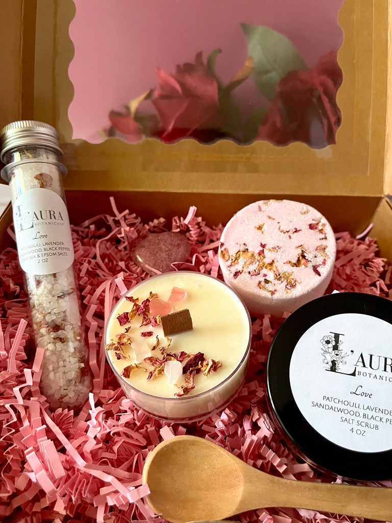 This set includes one 2 oz Dead Sea & Epsom Bath Salts tube, one 2 oz Soy Wood Wick Crystal Botanical Tealight, one 4 oz Dead Sea Salt Scrub infused with Grapeseed Oil, one 4 oz Shower Steamer/Bath Bomb, and a heart-shaped Rose Quartz.  All products are in our Love blend with notes of Patchouli, Lavender, Sandalwood, and Black Pepper.