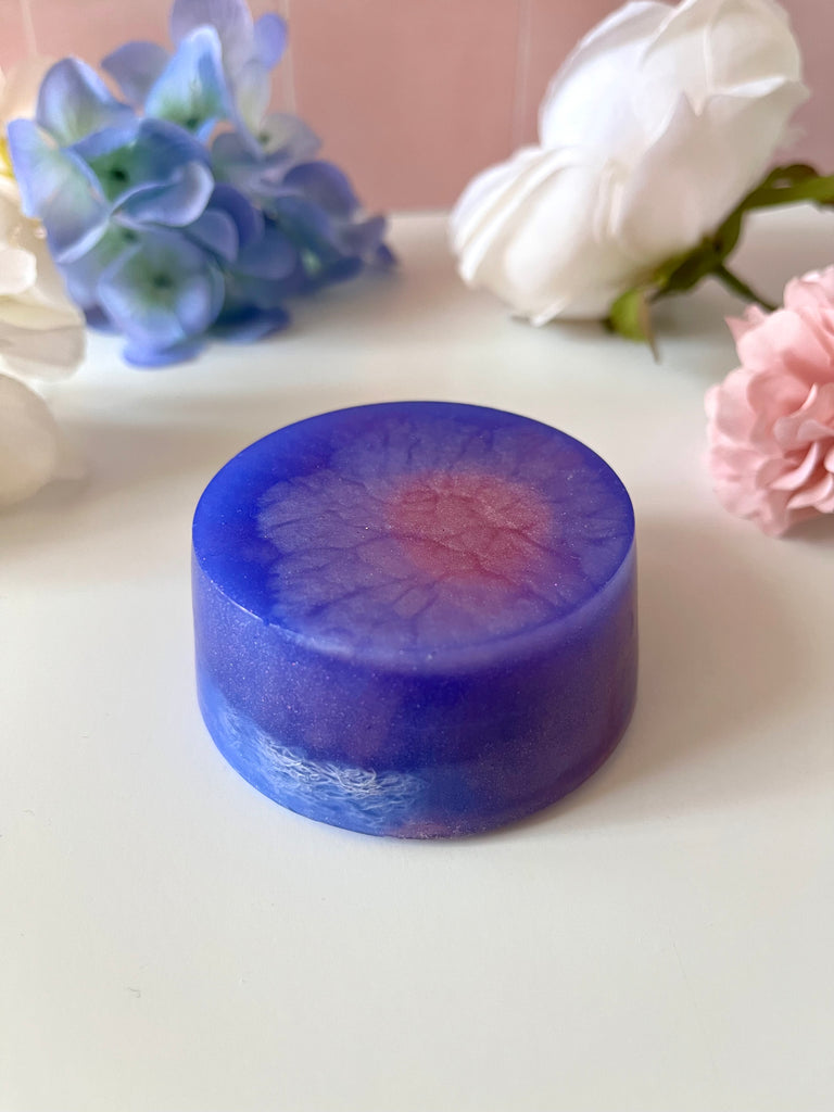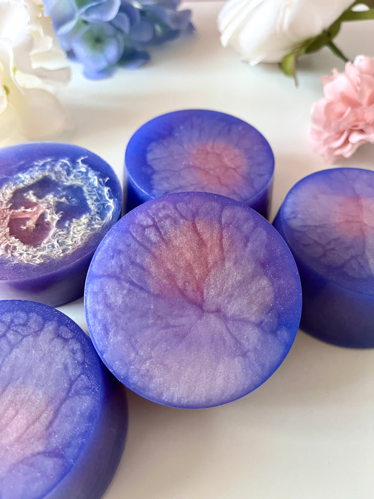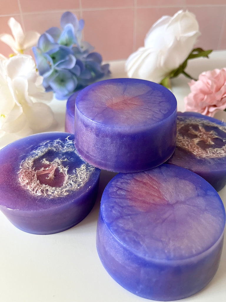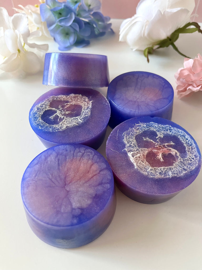 We small batch and hand pour our soap using a glycerin base infused with our aromatherapy oil blend so each bar is unique in coloring and design. A slice of natural loofah is tucked into each soap to exfoliate and make your skin happy.