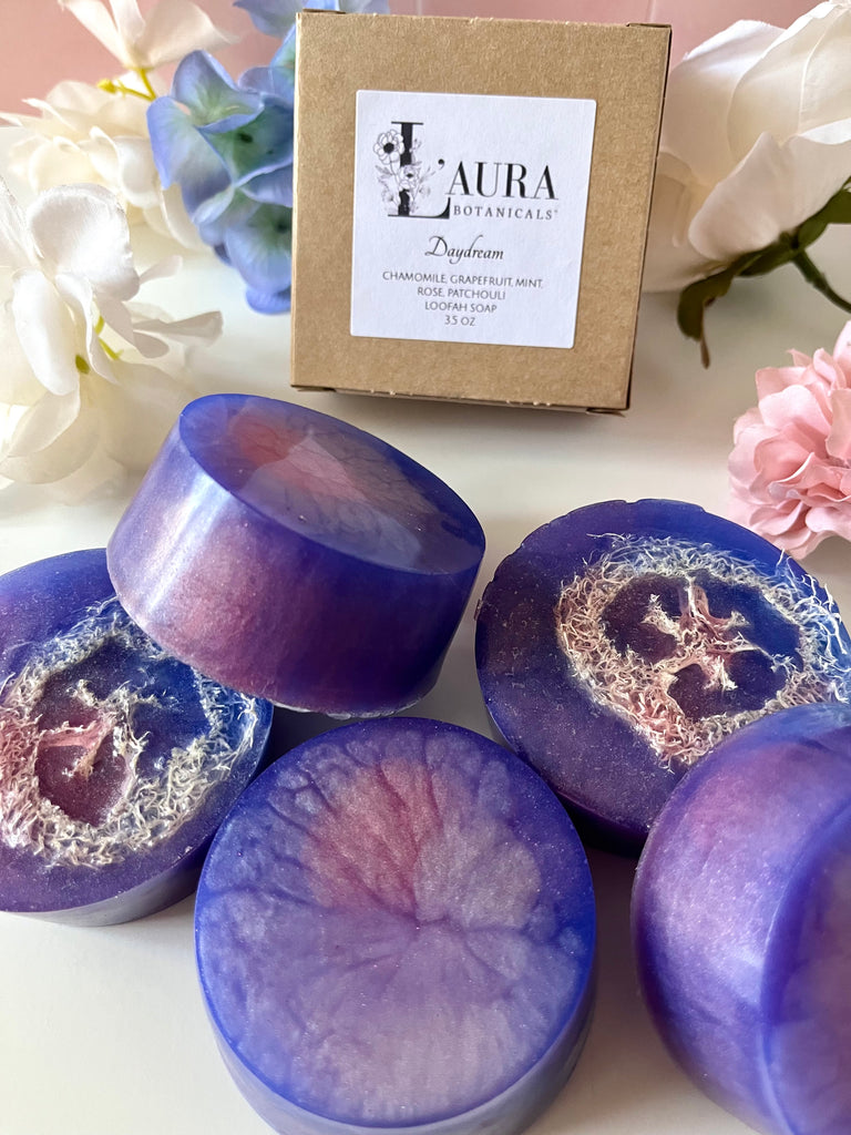 Take a moment to breathe every time you use our Daydream loofah soap with its notes of calming Chamomile, refreshing Grapefruit and Mint, soft Rose, and grounding Patchouli.