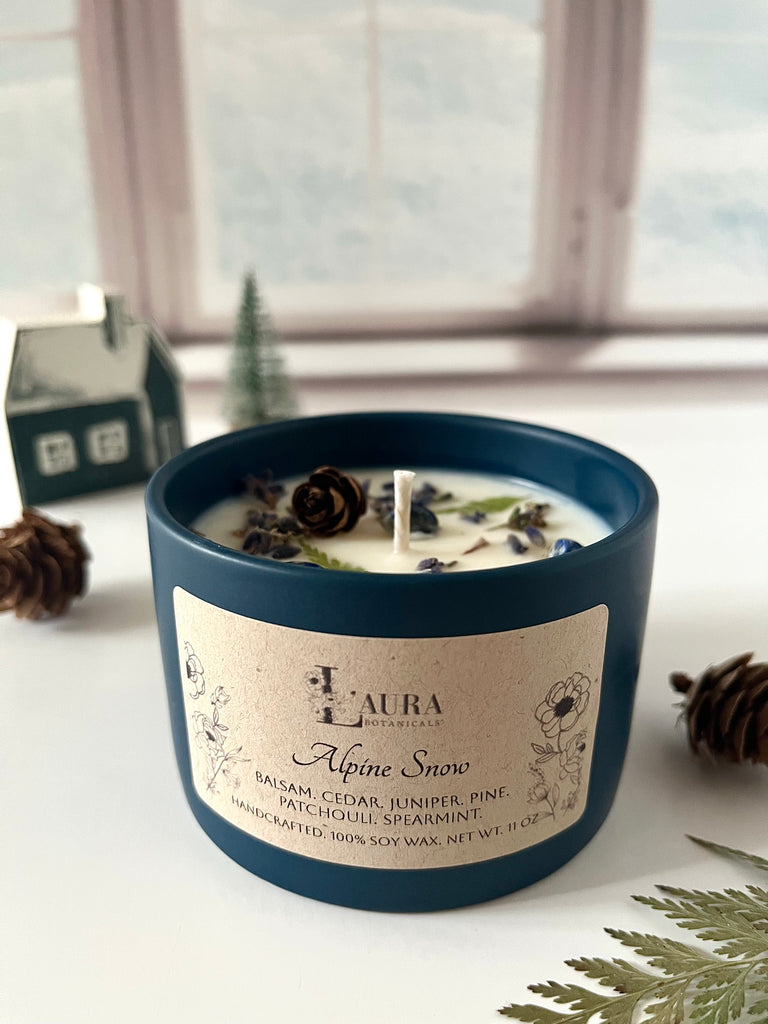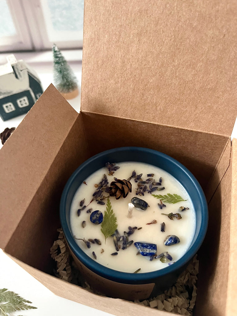 We hand pour each candle with 100% natural soy wax, infuse with our Alpine Snow blend, and sprinkle with mini pinecones, natural greenery, and pieces of Lapis Lazuli crystals for a little extra winter magic.