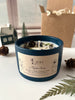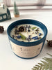 This listing is for one 11 oz blue ceramic tumbler natural soy wax candle infused with our Alpine Snow blend, nestled in a recyclable kraft box.